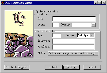 ![]() 下一步,請輸入你所在的國家 (city) (點選下的箭頭可出現你的國家)年齡 (age) ,性別 (gender),電話 (telephone),首頁位置 (homepage), 和有關你自己的短言 (Add your own personalize message) 選擇完後,請按Next繼續。 |