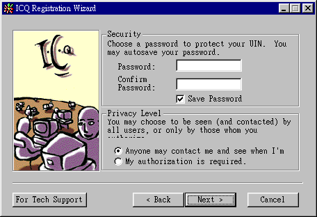![]() 再來,請在 Security欄框裡輸入你的密碼 (password) 並再確認一次密碼 (confirm password),在 privacy level則是第一格 (Anyone may contact me when I am online)是指說您的 UIN 開放給任何人加入聯絡名單, 不需經過您的同意; 而第二格 (my authorization is required)則是任何人要將您加入名單時都要經過您的 同意,這樣才不會造成無謂的困擾。 選擇完後,請按Next繼續。 |